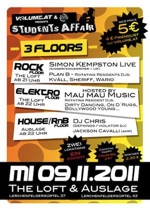 3 FLOORS // 2 LOKATIONS // 1 EINTRITT 1. FLOOR ELEKTRO/MASHUP hosted by MauMau Music http://www.facebook.com/MauMauMusic 2. FLOOR ROCK/INDIE hosted by Plan B 3. FLOOR HOUSE/R'N'B Dj Chris 4/ 5 EUR