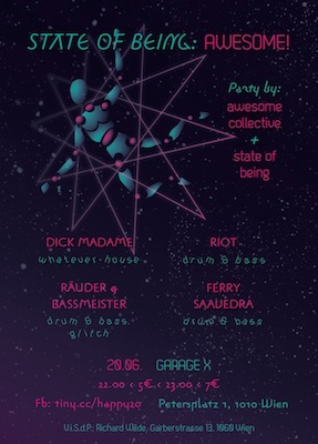 Die Partyreihe "State of Being" trifft das Partykollektiv "Awesome Collective" mit Drum & Bass von RIOT, Räuder & Bassmeister und Ferry Saavedra. Deep House von Dick Madame. 5-7€