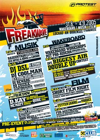 Freakwave05 ist in erster Linie auch ein Termin für Freunde der anspruchsvollem Turntable-, und Remixkunst. Beim in Kooperation mit FM4 stattfindenden Musikfestival am Samstag ab 11.00 Uhr werden österreichische und internationale DJ’s ihr Können zeigen. Mit dabei unter anderem Szenegrößen wie Dj DSL (G-Stone Rec.), Dj Coolman (Ex FünfSterneDeluxe), Dj Beware (Hongkong), Dj Zuzee (Waxolutionists), Elektrosacher (fx set, Ohm Rec.,Triest), Dj D.Kay (Ill.Skillz, Wien), DJ Qube (Rollerball), MC Matt (vocal breath..Bern)…