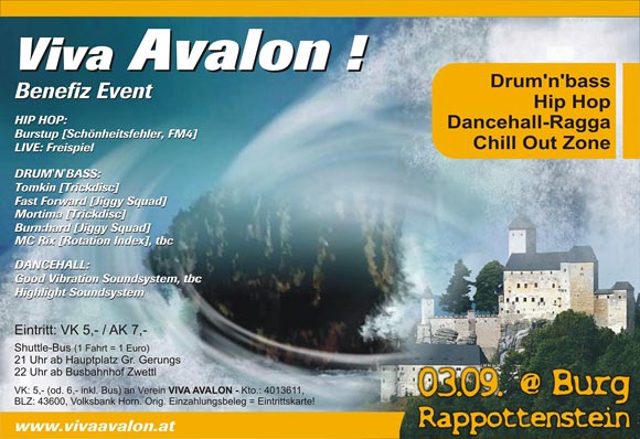 VORVERKAUF: 5 Euro an Verein VIVA AVALON, Kontonummer: 4013611, BLZ: 43600, Volksbank Horn. Original Einzahlungsbeleg gilt als Eintrittskarte.