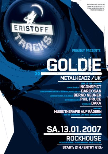 Mit «Terminator» legt der Brite Clifford Price alias Goldie Anfang der 90er den Grundstein für den Drum’n’Bass-Hype in London – und für den weltweiten Aufstieg der neuen Jugendkultur. Es folgt das Album «Timeless» und die Gründung von «Metalheadz Records», bis heute eines der wichtigsten und einflussreichsten Labels der Szene. Eristoff Tracks bringt den «Godfather of Drum’n’Bass» Goldie am 13. Jänner 2007 exklusiv ins Rockhouse in Salzburg. Be there!