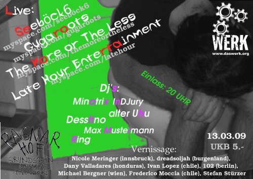 Der CD-Sampler ist endlich fertiggestellt worden und sucht nun Vergleichbares in der Aufgabe österreichische NachwuchsmusikerInnen zu fördern. Mit den drei Bands und einem elektronischen Liveact (Gugaroots, Seeböck6, The More or The Less, Late Hour Entertainment), die man auch auf der CD wiederfindet, einer Vernissage mit acht KünstlernInnen und sechs Dj's wird der sogenannte Geburtstag des Samplers zelebriert. Außerdem ist es auch schon die 120 Veranstaltung vom Kulturverein WERK und verspricht somit auch die eine oder andere Überraschung.