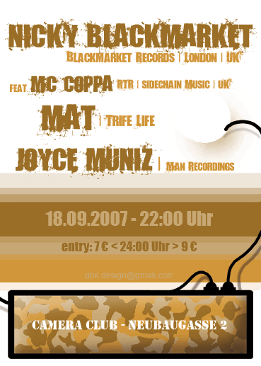 Nicky Blackmarket ist unserer meinung nach ein act den man sich auch wenn schon öfters gesehen/gehört immer wieder anschauen/hören kann....unbestechlicher charme gemischt mit unverwechselbarem UK style - nice one! Dazu MC Coppa (die beiden haben jahrelang englische raves unsicher gemacht - waren aber in der formation noch nie in Österreich)