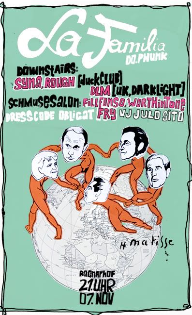 Für internationales Mafia-Flair ist jedenfalls gesorgt. Am Mainfloor drückt DJ-Pate syna auf den hiphop-Abzug, Oberganove DJ Rough von der duckclub-familia erpresst euch mit Electrobeats und Briten-Knacki DLM geht mit Trommeln und Bass flöten.