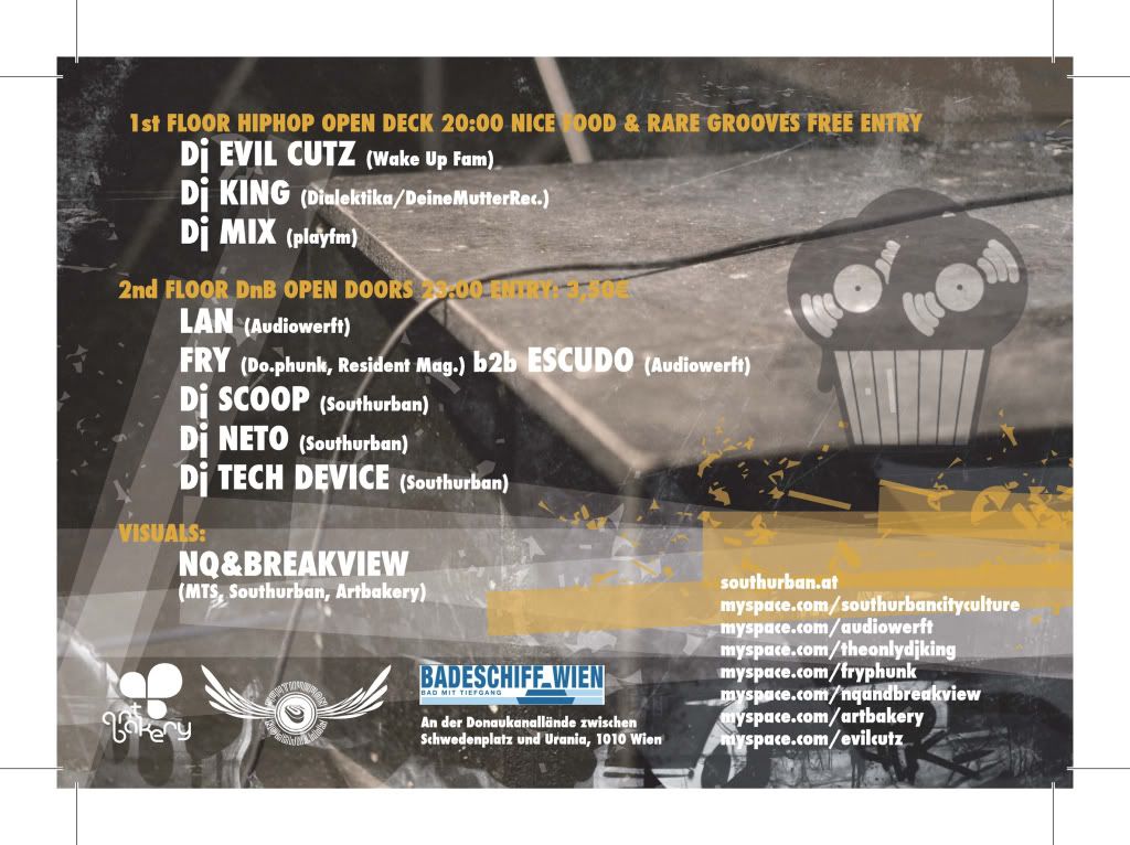 Im Laderaum lässt Southurban dann einige ihrer Djs, Dj Neto, DJ Scoop und DJ TechDevice auf die Wiener Crowd los und garantiert eine fette Drum’n’Bass Shake Orgie. Fry, seit langem bekanntes und schon vielfach gefeiertes DJ-Genie der Do.Phunk Partie wird mit den absoluten Wiener Lieblingsdj’s von Audiowerft, Escudo und Lan für den Rest sorgen - bis der Morgen graut.