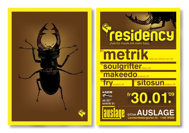 Residency ist unsere neue Clubnight, die sich vorallem durch ausgefallene und abwechslungsreiche Bookings auszeichnet. Außerdem legen wir großen Wert auf Visuals. Mit eigenem VJ-Lineup und aufwendigen Raumkonzepten werden wir die Auslage jedes mal neu gestalten. Mit der neuen Location wird eine besondere Atmosphäre geschaffen, die sich in den Köpfen festsetzen soll. Frei nach dem Motto: Drum'n'Bass muss nicht immer in dunklen Clubs zu finden sein.