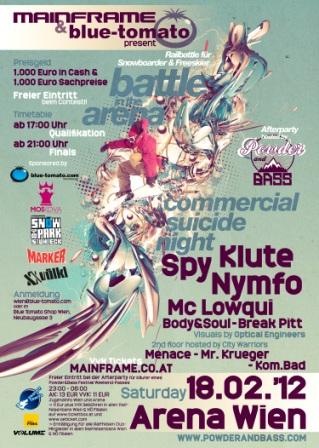 added by combo | | 18.02. | Mainframe | & blue-tomato pres. BATTLE IN THE ARENA – Railbattle für Snowboarder & Freeskier - Afterparty hosted by Powder & Bass: COMMERCIAL SUICIDE NIGHT feat. KLUTE, SPY, NYMFO & MC LOWQUI, Arena Wien |