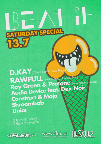 D.KAY (Metalheadz, Hospital) RAWFULL (Critical, Virus) RoyGreen & Protone (Innerground, Fokuz) Audio Device feat. Dex Noir Construct & Mojo Shroombab Unics 5 €uro til midnight 7 €uro afterwards