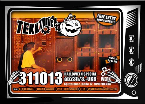 added by tomtekk | | 31.10. | TEKKTONIC | DAS WERK Spittelauer Lände 12 Stadtbahnbogen 331 1090 Wien , VIENNA |