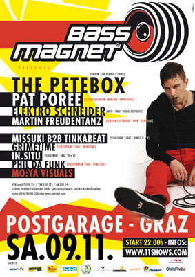 BASS MAGNET presents PETEBOX * PAT POREE * ELEKTROSCHNEIDER * Martin Freudentanz * Missuki b2b Tinkabeat * Grimetime * in.situ * Phil da Funk ::: hosted by 11SHOWS | | 3 comment(s) |