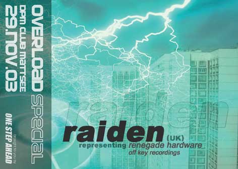 Raidens ideal is progressive music with a beginning, middle and end, but retaining the off-key hooks, the ability to shock. The end result sounds a little (but not quite) like Stay Up Forever remixing No U-Turn (or vice versa); heavy rolling tech-step breaks, vicious synth head noises, and basslines that you could mistake for seismic events. His ascent though the scene has been an unprecendented success, this rise is far from over, you have been warned!'