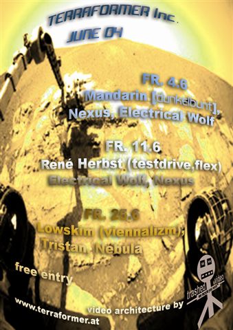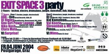 Die Präsentation und Diskussion findet am Freitag, dem 4.Juni 2004 im Forum Stadtpark statt.. danach gibt es Essen von „Food Not Bombs“ und ein EXIT SPACE DJ-Lineup im Parkhouse, sowie eine hochkarätige 2-Floor Party in der Postgarage ab 23.00 Uhr.
