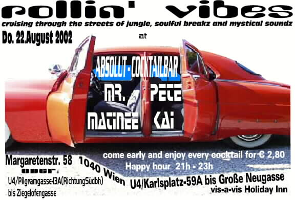 cruising through the streets of jungle, soulful breakz and mystical soundz Do. 22. August @ ABSOLUT - COCKTAILBAR with Pete Kai & Mr. Matinee Margaretenstr.58 1040 Wien Happyhour 21h - 23h tasty cocktails for 2.80EURO