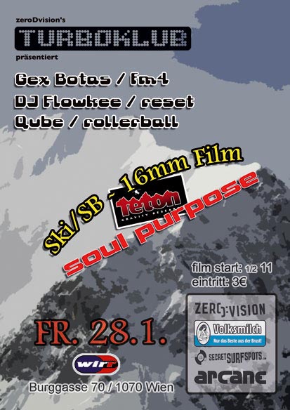 auf beiden Ebenen wird ab 22h30 (s.t.) der neue 16mm Schi- und Snowboardfilm "Soul Purpose", der befreundeten Produktion Teton Gravity wien-uraufgeführt.