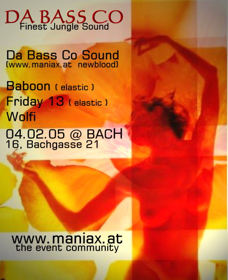 Die erst kürzlich zu MANIAX dazugestoßene Formation DA BASS CO. wird am 04. Februar im Bach ihr bestes geben. Zu erwarten sind feinste Tunes aus dem Bereich Jungle, Drum and Bass, Reggae, Ragga, Techno, Ska. Gemixt wird das ganze in einem gwohnten "wicked"-style. Dabei werden sie von harten gebrettere der e-lastic.at Crew unterstützt werden. Aufjedenfall wert sich anzuhören und abzugehn ::: hosted by www.maniax.at | | 0 comments |