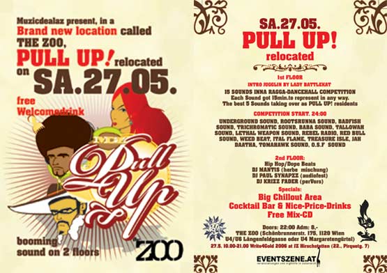 Am Hauptfloor findet ein Wettbewerb unter 15 verschiedenen nationalen Reggae Dancehall Sounds (DJs & MCs) statt. Jeder Sound hat 15 min. Zeit, um sich in jeglicher Form (z.B. mitDubplates, übers Mic, durch eigens kreierte Tänze...) zu präsentieren. Die 5 besten Sounds dieses Abends werden auf den kommenden “PULL UP!“ Veranstaltungen das Resident DJ-Team bilden. Ausgewählt werden diese Gewinner durch Videoanalyse von der MDZ Crew.
