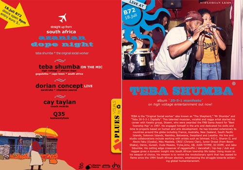 TEBA is the “Original Social worker” also known as “The Shepherd,” “Mr Shumba” and “Teba 20-5-2-1 Digitally”. This talented musician, vocalist and ragga artist started his career with Kwaito group, Skeem, who were awarded the FNB Sama Award for “Best Township Pop” in 1997. He engaged himself in the arts and dedicated his skills and time to projects based on human and arts development. He has traveled extensively to countries around the globe including France, Australia, New Zealand, South Pacific Islands, Solomon Islands, Namibia, Botswana, Swaziland and Lesotho. His live and studio collaborations include working with artists such as Ishmael, P.O.C, Sharon D, and Alexis Faku (Oyaba), Mdu Masilela, CROZ (Chronic Clan), Junior Dread (from Boom Shaka), Derex, Gurash, Oude Meeste, Trybe,Amu, KB, JUAN THYME, DJ DOPE, and Jabu Sibumbe. His cutting edge crossover of raggamuffin / dancehall / hip-hop / dub and reggae gives a dynamic insight into South African township life today. Using music as his weapon of choice, his mission is to revive the revolutionary spirit that has ceased to flame since the 1994 South African election, emphasizing the struggle towards achieving global humanitarianism. ::: hosted by unknown |