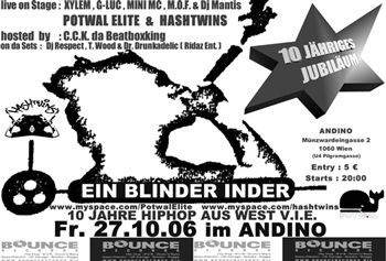 10 Jahre Bestehen feiert EIN BLINDER INDER mit Hashtwins, Potwal Elite MOF & Mantis , CCK, Ridaz Dj's u.v.m. ::: hosted by Dr.Drunkadelik | | 0 comments |