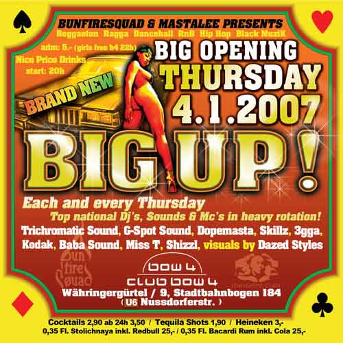 Das führende Top Dancehall Promotion Team BUNFIRESQUAD eröffnet am Donnerstag, den 4.1.2007 einen neuen, wöchentlichen Club namens BIG UP!