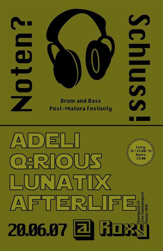 All die glücklichen Leute die gerade eben ihre Matura hinter sich gebracht haben und alle anderen die einfach Lust auf guten Drum&Bass (von soulful bis massive) und hemmungslose Party haben, sind herzlichst eingeladen am 20.06 ins Wiener Roxy zu kommen, um dort bei einem schnippischen Eintrittspreis von 3€ (ab 12:00 5€) den Duft der Freiheit - und letztendlich auch den Duft der Eigenverantwortung :) - zu genießen!