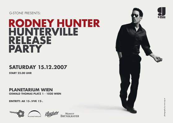 Tanzbodenfüllend und hochgradig iPod-tauglich zugleich. Am 15.12.2007 steigt in Kooperation mit der Veranstaltungsreihe supersonic die Album Release Party im Planetarium beim Riesenrad, Wiens angesagtester Underground Location. Eingeladen hat Hunter nicht nur die Label Bosse Peter Kruder und Richard Dorfeister, sowie seinen Label Kollegen Urbs und Fauna Flasher Christian Prommer, sondern auch seine ehemalige uptight Live Formation, die Aphrodelics. Ein wahrlich exklusives Line Up; und was wäre eine G-Stone Party ohne eine gute Falsche Wein?! Dafür sorgt das Weingut Bründlmayer mit eigener Weinbar. Weiters stellt die Klangfarbe eine ihrer besten Live Analagen für diesen Abend zur Verfügung, damit selbst Soundgourmets nichts zu meckern haben. Wir wünschen viel Spass und empfehlen den limitierten VVK bei Jugend in Wien, 12 Euro Hamerlingsplatz 1 1080 Wien.