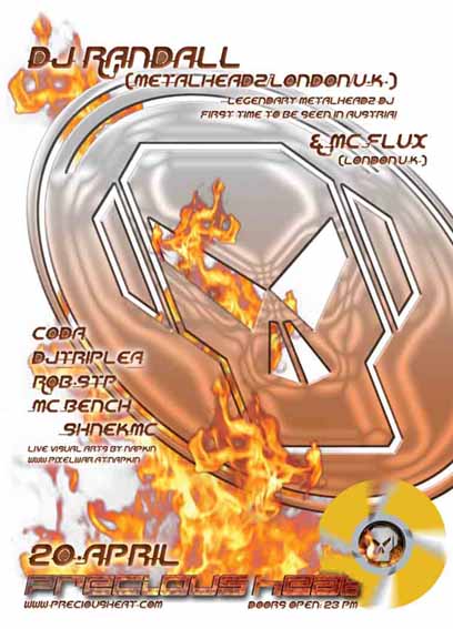 Dj Randall (Metalheadz/London/U.K.) Mc Flux (London/U.K.) Dj_Triple_A Coda Rob.Stp ShnekMC Mc Bench Live Visual Arts by napkin www.pixelwar.at/napkin more info soon at www.preciousheat.com let's celebrate easter sunday! :)