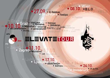 Die Elevate-Tour ist eine Initiative des gleichnamigen Festivals, das dazu dient, junge österreichische KünstlerInnen einerseits international vorzustellen und andererseits das Programm des Elevate-Festivals zu vermitteln. Mit 6 Stops in 4 Ländern und 25 beteiligten KünstlerInnen bietet die Tour interessierten HörerInnen einen Querschnitt jungen heimischen Musikschaffens – ebenso wie die Elevate Compilation-CD 2008, die 17 frische Hörproben liefert – frei Haus!