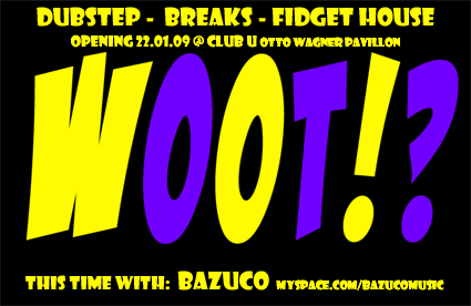 „Woot!?“ ist der Name und gleichzeitig Programm des Clubs. „Woot!?“ ist in den Köpfen der Crowd wenn sie sich fragen wird welcher Tune gerade am Plattenteller serviert wird weil er in kein Genre passt. Von Dubstep über Nu Skool Breaks bis hin zu Fidget House und undefinierbarem Electro Stuff gepaart mit Visuals erster Güte wird ein Mix kredenzt, der nicht jedem gefallen, allerdings denen, die sich open-minded auf die Reise einlassen, ein unvergesslicher Genuss für Ohren und Augen sein wird.