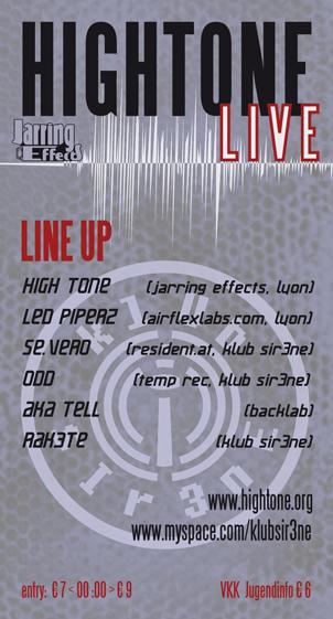 High Tone übersetzen die Vielfalt der aktuellen Dubszene in eine treibende Live Show, die auf den Wurzeln des Dub aufbaut und sich gleichzeitig der elektronischen Klangästhetik des Dub Step bis hin zum Techno bedient.