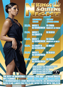 Kings & Queens Night The best of Dancehall, Reggae, HipHop, African Music on 2 Floors! Dj's: SickChick, Miss T, 3gga, Ololo Start: 22:00 Ladies free till 23:00 Gate: 7€, 5€ with Flyer Location: Camera Club 1070 Wien 7.