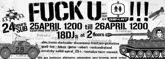 18 mutige und ambitionierte G24 User bespielen 24 Stunden lang das SUB (Kaiser Franz Josefs Kai 66). Als mehr oder weniger professionelle DJ's werden sie auf 2 Floors ihre Lieblingslieder und Stile zum besten geben. Die Palette der dargebotenen Genres reicht dabei von Techno, Goa, Drum and Bass am unteren Floor, bis zur "B-Seite des Lebens" upstairs: Rock, Pop, Metall, Hymnen, House, NDW... nichts wird hier ausgeschlossen und kann ausgeschlossen werden. ::: hosted by g24.at | | 5 comment(s) |