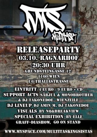 MTS präsentieren am 3. Oktober 2009 ihr erstes Album „Multitask" m Ragnarhof (Grundsteingasse 2, 1160 Wien). „Multitask" umfasst den kreativen Output von eineinhalb Jahren MTS, der Titel des Albums steht für die Vielschichtigkeit der Themen und Styles der sechs Mitglieder, die auf den 22 Titeln behandelt werden. Die Beats stammen von Producern wie D-Mindz, Whizz Vienna, Säbjul, Resist, Flip-o-mat und Fid Mella, ein Teil wurde auch von der MTS Crew selbst beigesteuert.