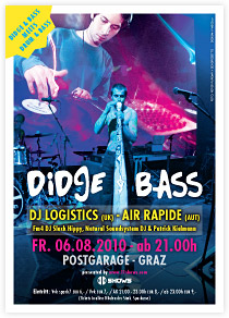 Daher setzt man am 06.08.2010 bei „Didge & Bass meets Drum & Bass“ in der Postgarage auf eine Fusion von Didgeridoo mit feinstem Drum´n Bass auf Vinyl. Als internationalen Hauptact holt sich 11 SHOWS niemand geringeren als Matt Gresham aka „LOGISTICS“, das jüngste Mitglied aus der „Hospital family“, einen der derzeit meist umworbenen DJs in der internationalen Szene.