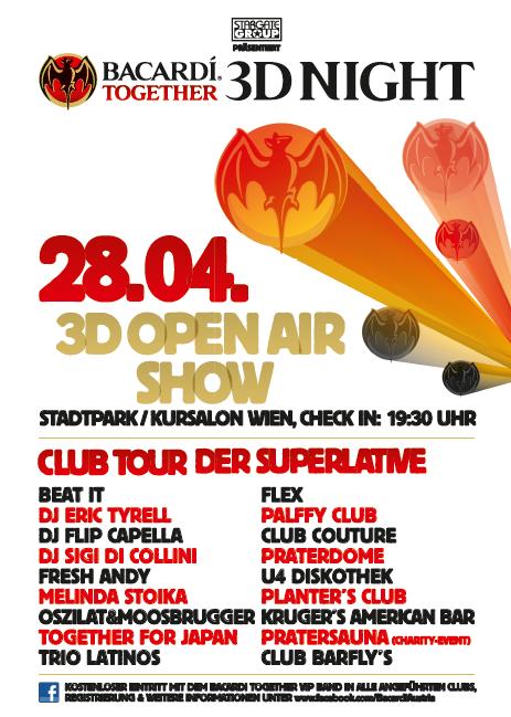 Im Anschluss an die BACARDI TOGETHER 3D OPEN AIR SHOW lädt BACARDI zu einer Club-Tour der Superlative und bietet die Möglichkeit, in insgesamt 9 Locations in Wien die Nacht zum Tag zu machen!