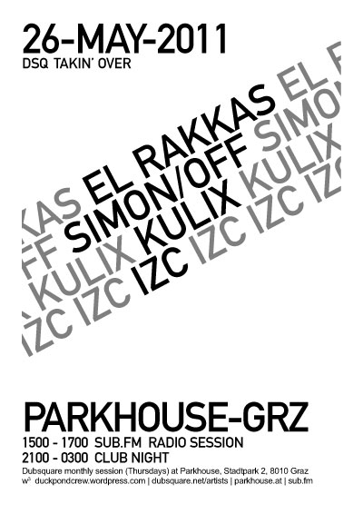 15 - 17h: Public live radio session on Sub.FM DJs Kulix (Duckpond, Graz), Simon/off & IZC 21 - 3h: monthly club night at Parkhouse DJs El Rakkas (Off Season/Dubsquare/Lo Dubs, Graz), Simon/off & IZC
